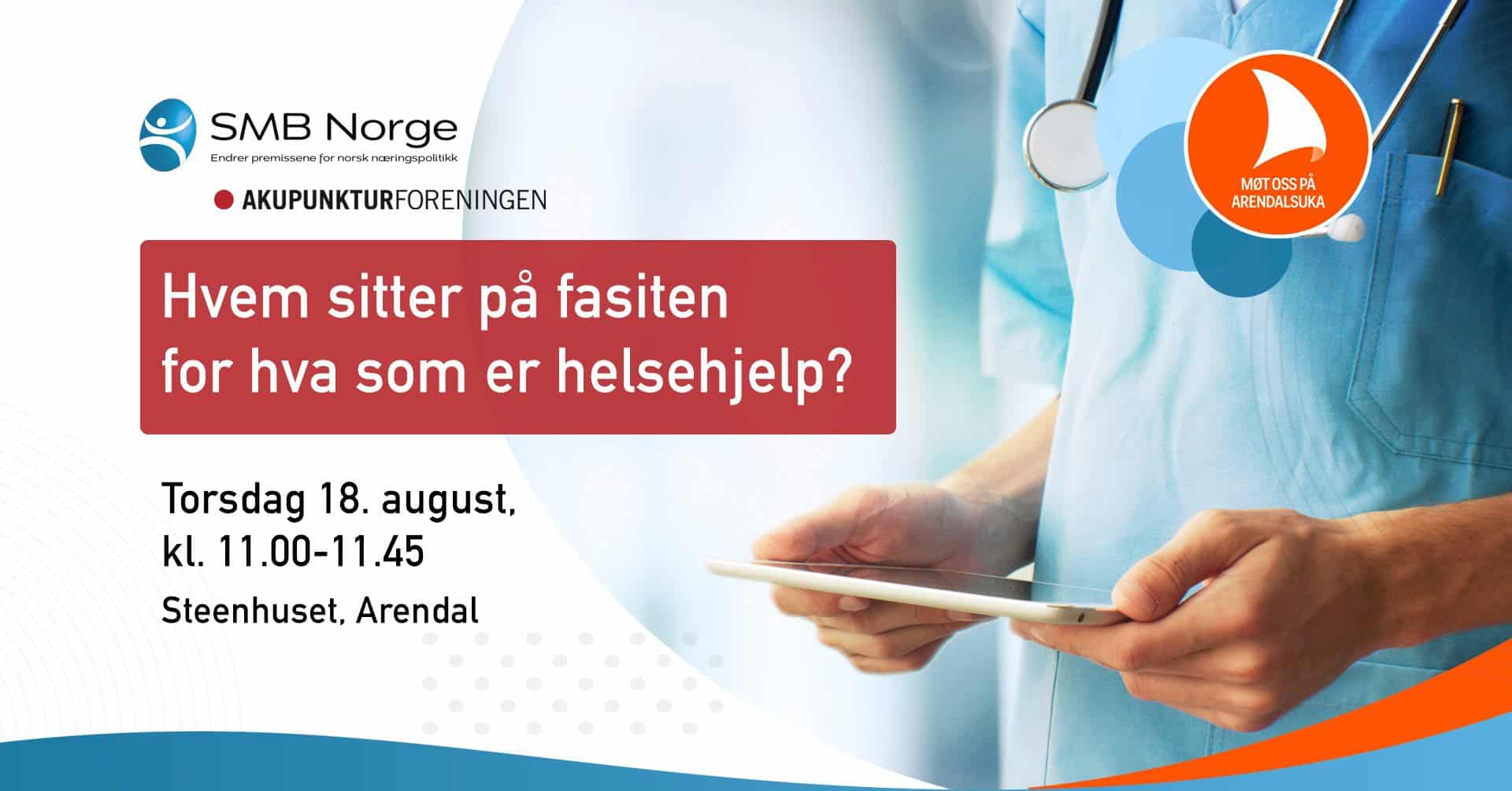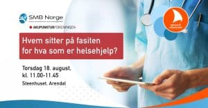 Torsdag 18. august kl. 11.00-11.45 i SMB-teltet ved Steenhuset i Arendal avholder SMB Norge og Akupunkturforeningen, som er kollektivt medlem i SMB Norge, et felles arrangement om situasjonen for akupunktørene.