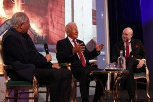 Carl I. Hagen under sofaprat med Truls Berg og Jørund Rytman.